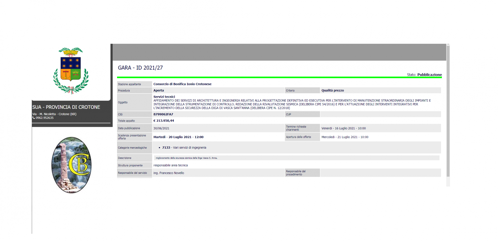 Servizi tecnici AFFIDAMENTO DEI SERVIZI DI ARCHITETTURA E INGEGNERIA RELATIVI ALLA PROGETTAZIONE DEFINITIVA ED ESECUTIVA PER L’INTERVENTO DI MANUTENZIONE STRAORDINARIA DEGLI IMPIANTI E INTEGRAZIONE DELLA STRUMENTAZIONE DI CONTROLLO, REDAZIONE DELLA RIVALUTAZIONE SISMICA (DELIBERA CIPE 54/2016) E PER L’ATTUAZIONE DEGLI INTERVENTI...