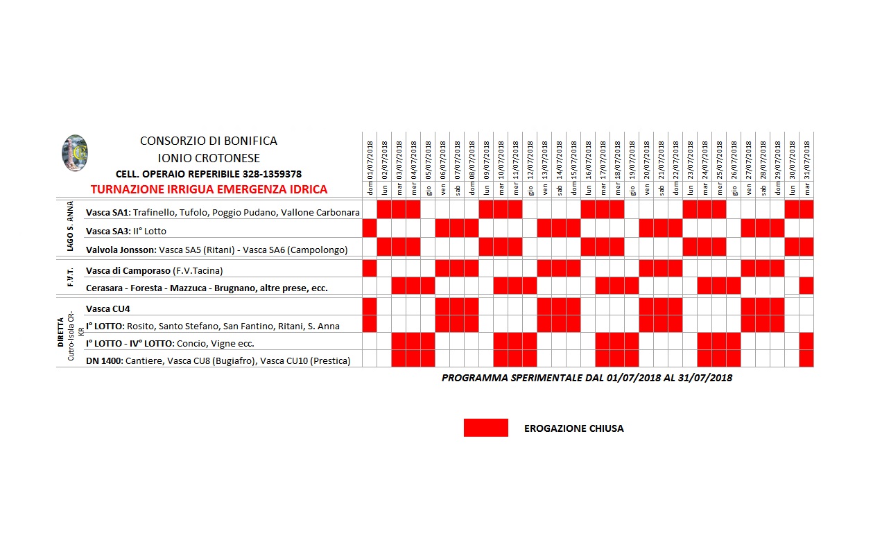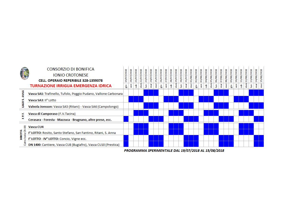 Così come preannunciato più volte, il Consorzio attua la terza turnazione come da schema in figura; la presente, dal 19/07 sostituisce ed integra quella precedente del 1°...