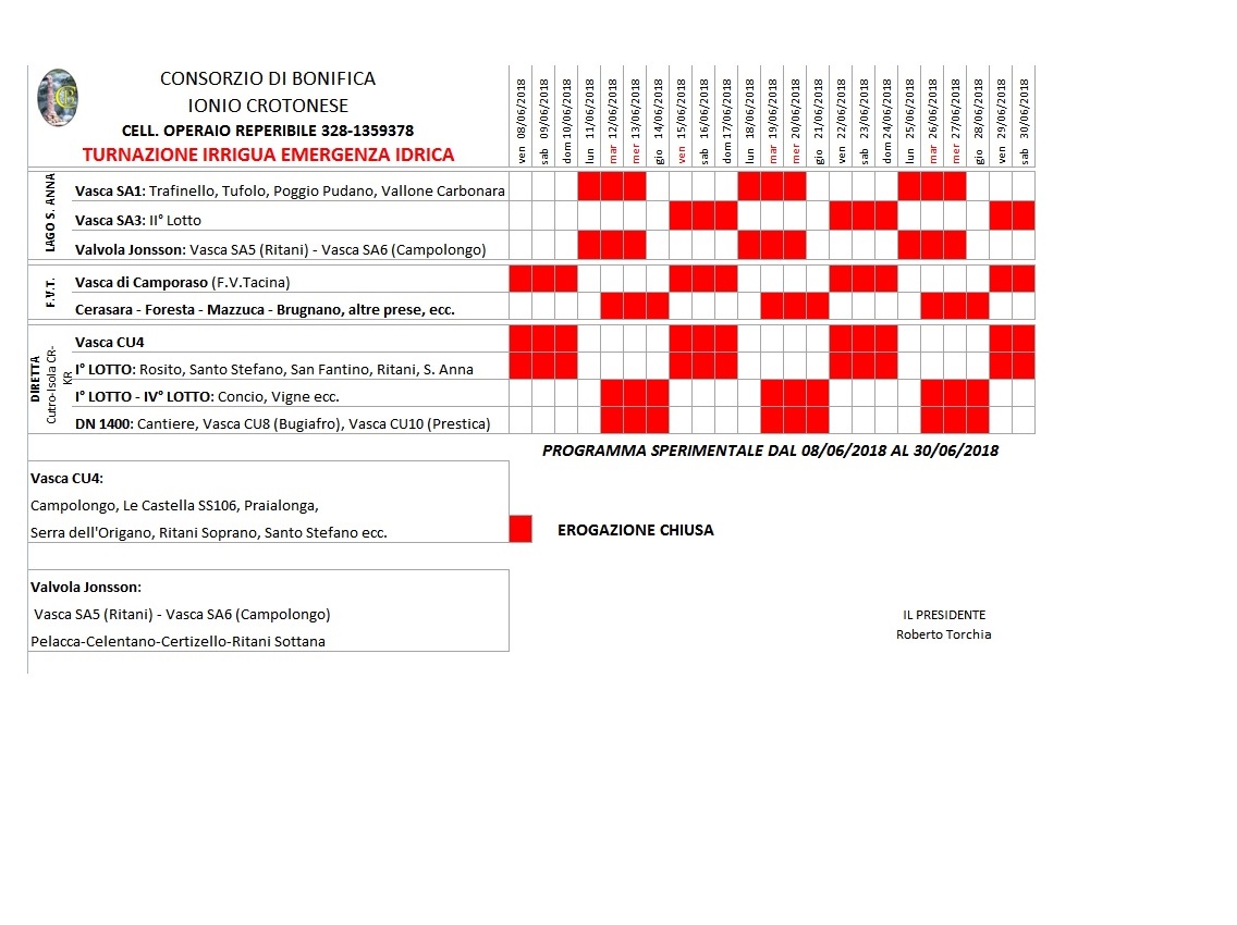 Così come preannunciato più volte, il Consorzio attua la prima turnazione sperimentale così come da schema in figura