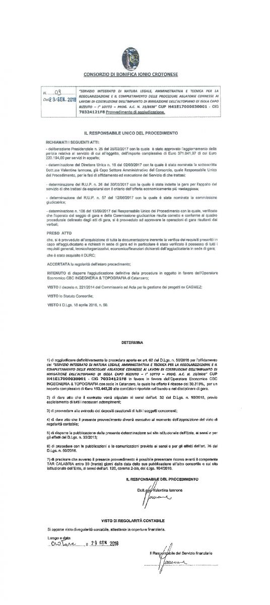 Affidamento del "Servizio integrato di natura legale, amministrativa e tecnica per la regolarizzazione e il completamento delle procedure ablatorie connesse ai lavori di costruzione dell'impianto di irrigazione dell'altopiano di Isola Capo Rizzuto - I° lotto - prog. A.C. n...