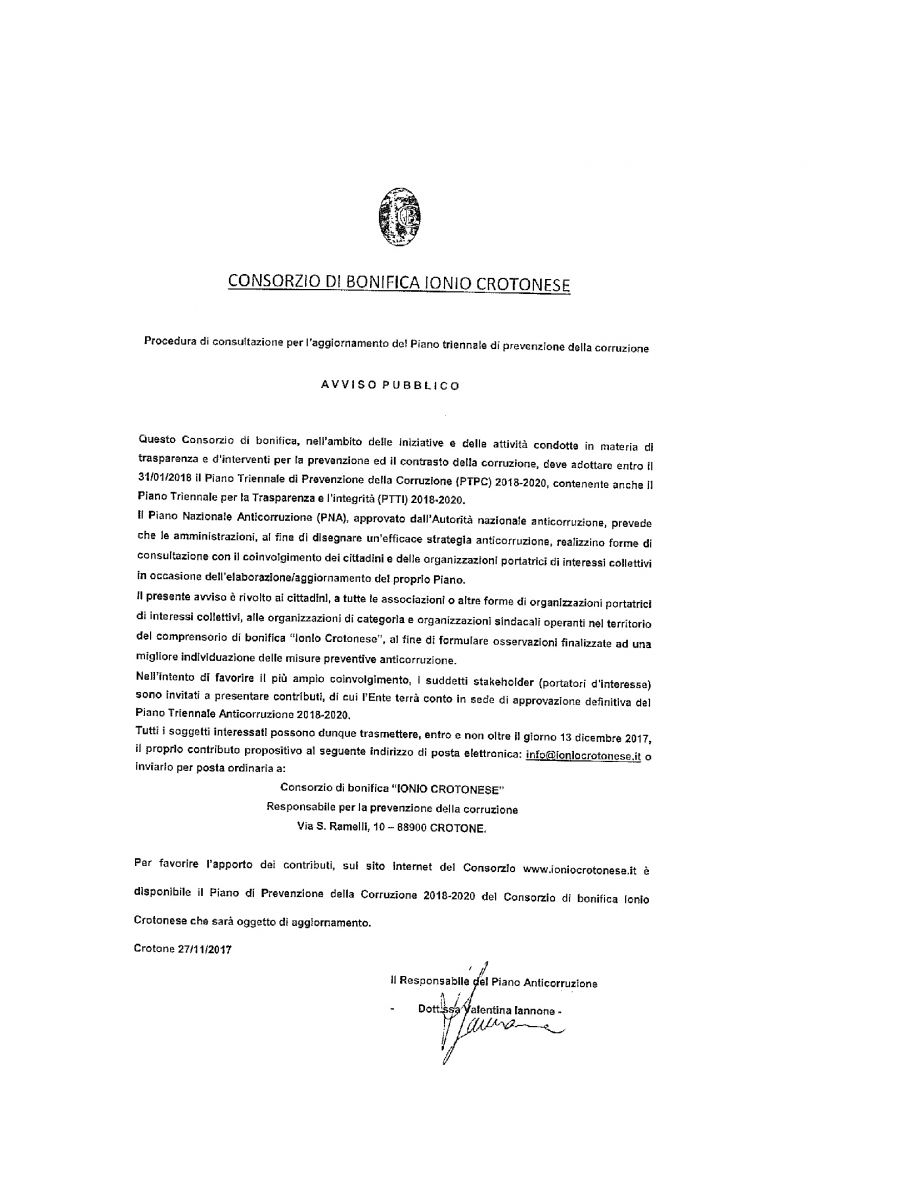 SI RENDE NOTO Che il sorteggio per la selezione degli operatori economici da invitare alla Procedura negoziata fissato per giorno 04/05/2018 alle ore 10:00 in seduta pubblica presso la Sala Consiglio del Consorzio di Bonifica Ionio crotonese in Via S. Ramelli,10 – 88900 CROTONE E’ rinviato a giorno 7/05/2018 stessa ora stesso...