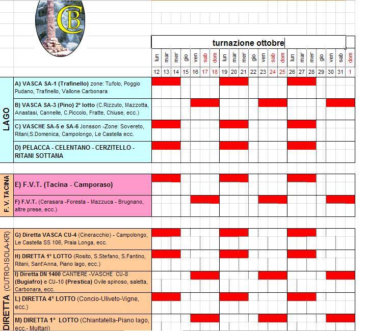 Legenda schema: Il rosso sta a segnalare la chiusura della fornitura! TURNAZIONE FORNITURA IDRICA USO AGRICOLO ED EXTRAGRICOLO DAL 12 OTTOBRE AL 31 OTTOBRE 2015 SI COMUNICA Che, nonostante l’impegno massimo profuso dal Consorzio di Bonifica teso a preservare la risorsa idrica per le varie utenze,...
