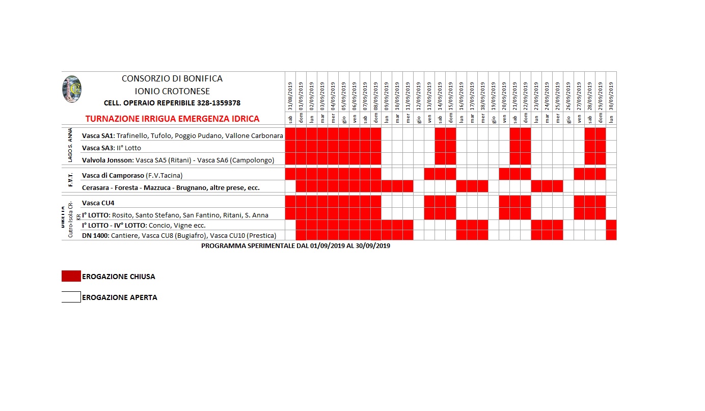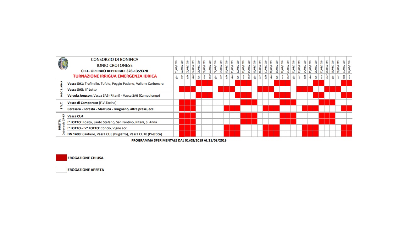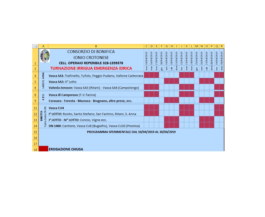 Con riferimento alla nuova stagione irrigua 2019 (Aprile-Settembre) è stata programmata una turnazione irrigua sperimentale come da tabella: