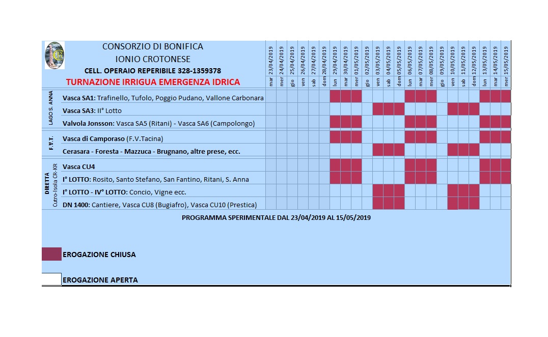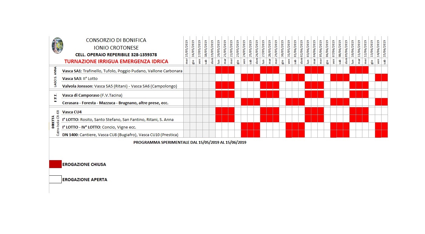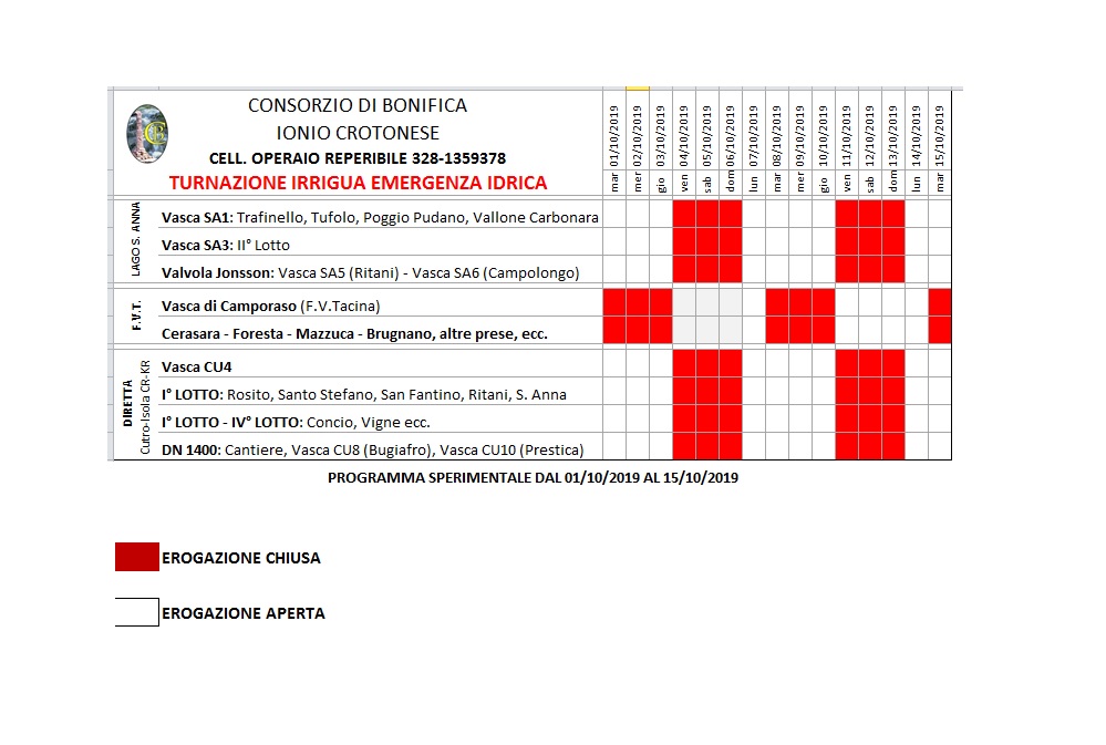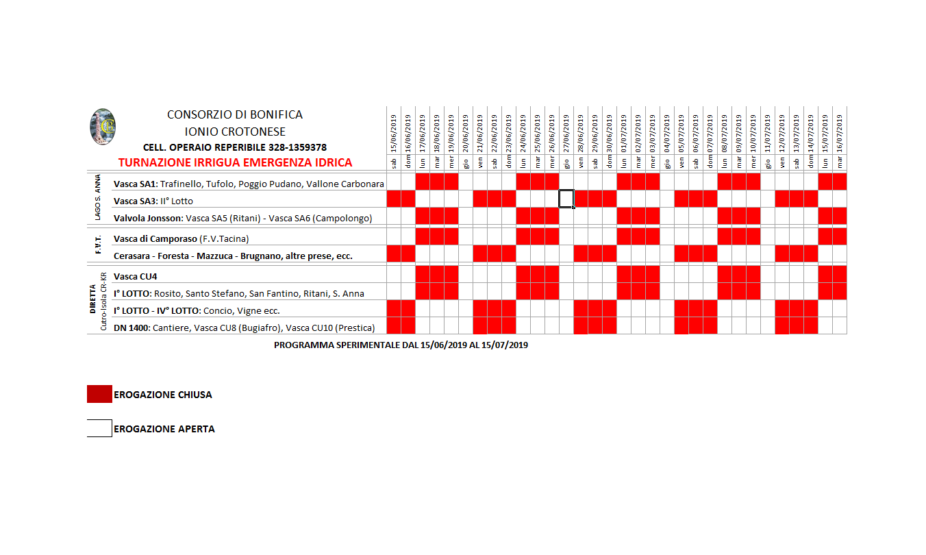 Con riferimento alla nuova stagione irrigua 2019 (Aprile-Settembre) è stata programmata una turnazione irrigua sperimentale come da tabella: