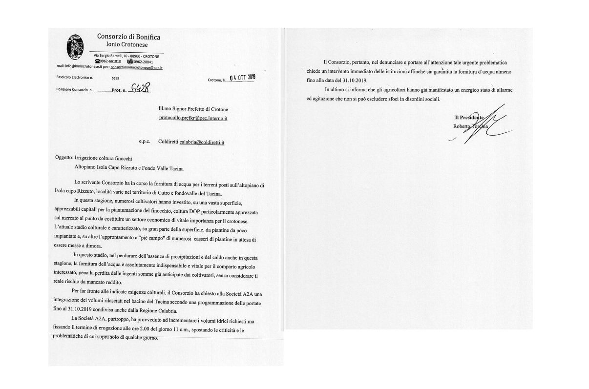 Il Presidente Torchia scrive anche al Prefetto, e per conoscenza a Coldiretti, per attenzionare la grave situazione: