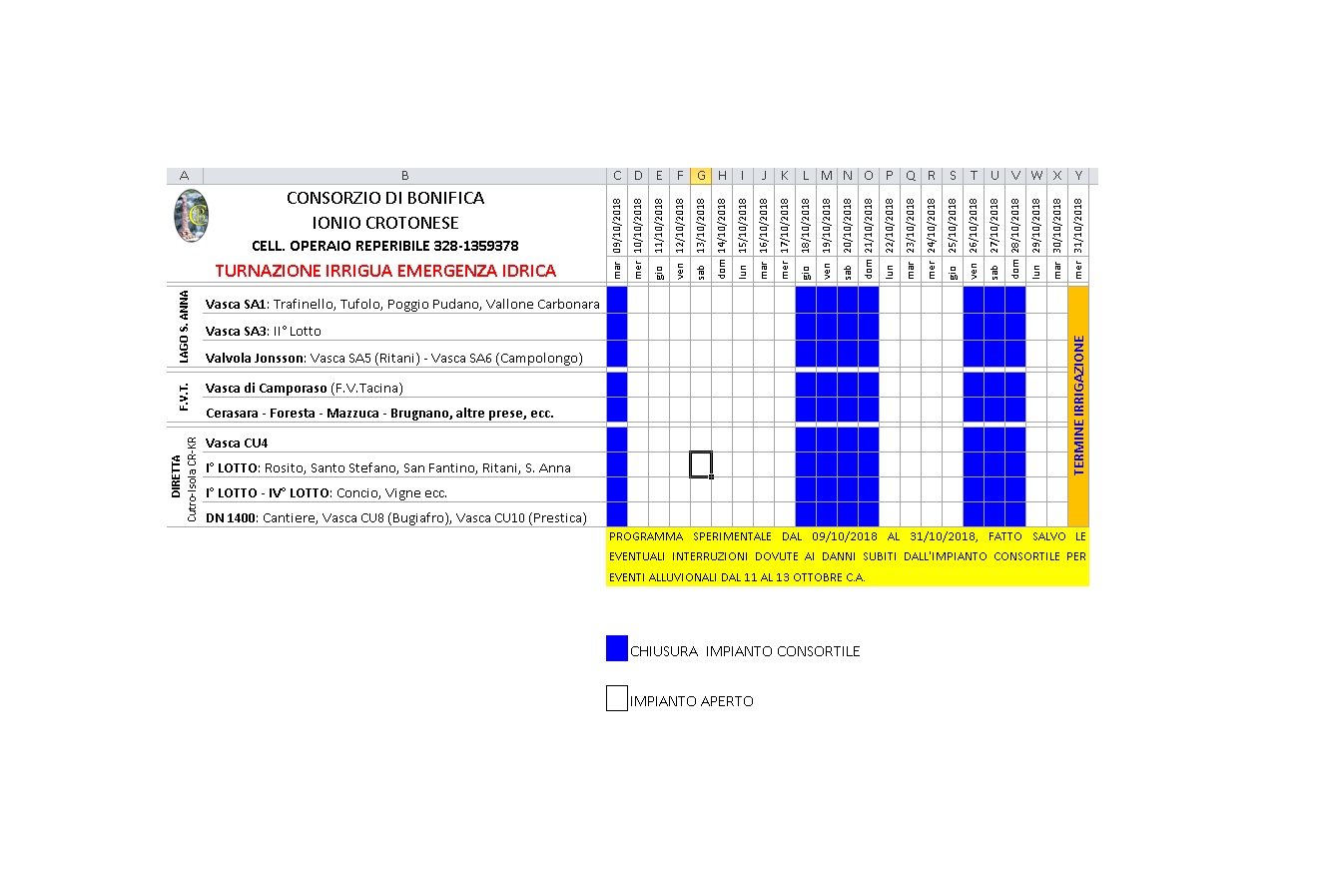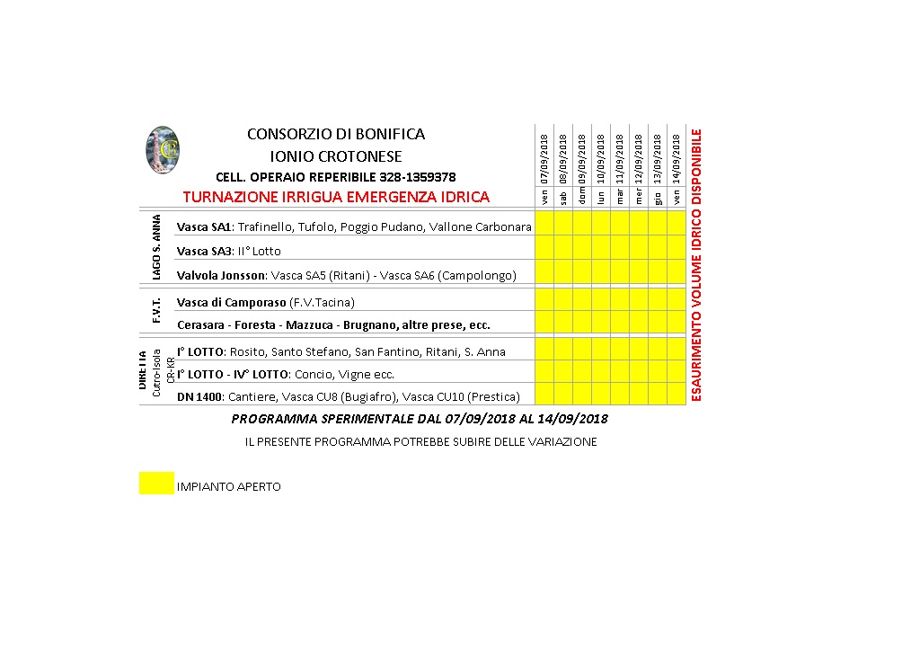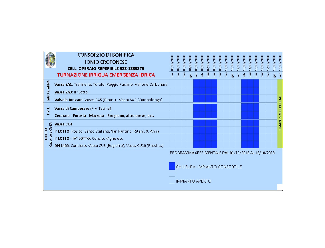 Così come preannunciato più volte, il Consorzio attua una nuova turnazione come da schema in figura; la presente in figura, dal 7 settembre p.v., sostituisce ed integra quelle...