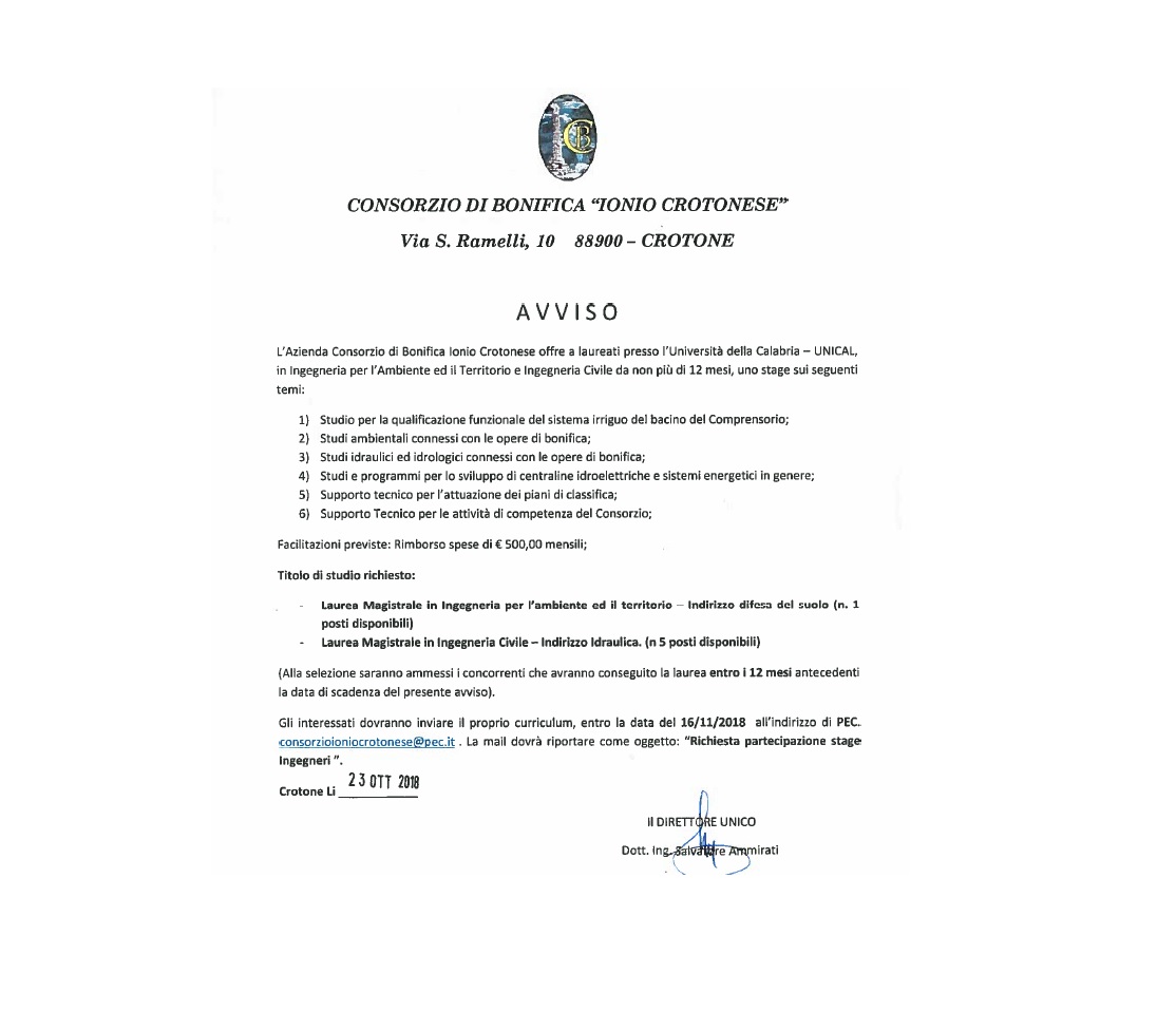 A V V I S O L’Azienda Consorzio di Bonifica Ionio Crotonese offre a laureati presso l’Università della Calabria – UNICAL, in Ingegneria per l’Ambiente ed il Territorio e Ingegneria Civile da non più di 12 mesi, uno stage sui seguenti temi: 1) Studio per la qualificazione...