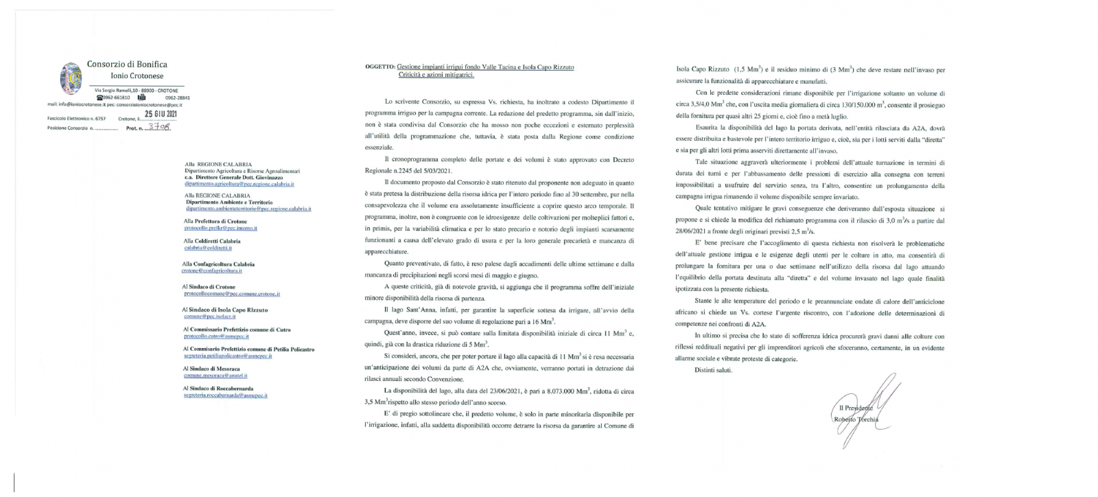 Abbiamo già detto, nel Comunicato/Avviso del 17 Giugno u.s., la campagna irrigua di quest’anno è partita già svantaggiata a causa del ridotto volume di acqua disponibile e per la prolungata mancanza di pioggia nelle passate stagioni; oltre alle raccomandazioni a tutti per un uso oculato, abbiamo anche inviato una nota a Società A2A, Regione Calabria, Prefettura e tutti gli altri enti interessati, per richiedere ulteriori rilasci oltre a quello residuo da noi individuato da Convenzione, che è stato di circa 500.000 metri cubi. Pensiamo non vi sia alcuna necessità di sottolineare quanto stia facendo caldo in queste settimane e quanto possano soffrirne le colture in atto.