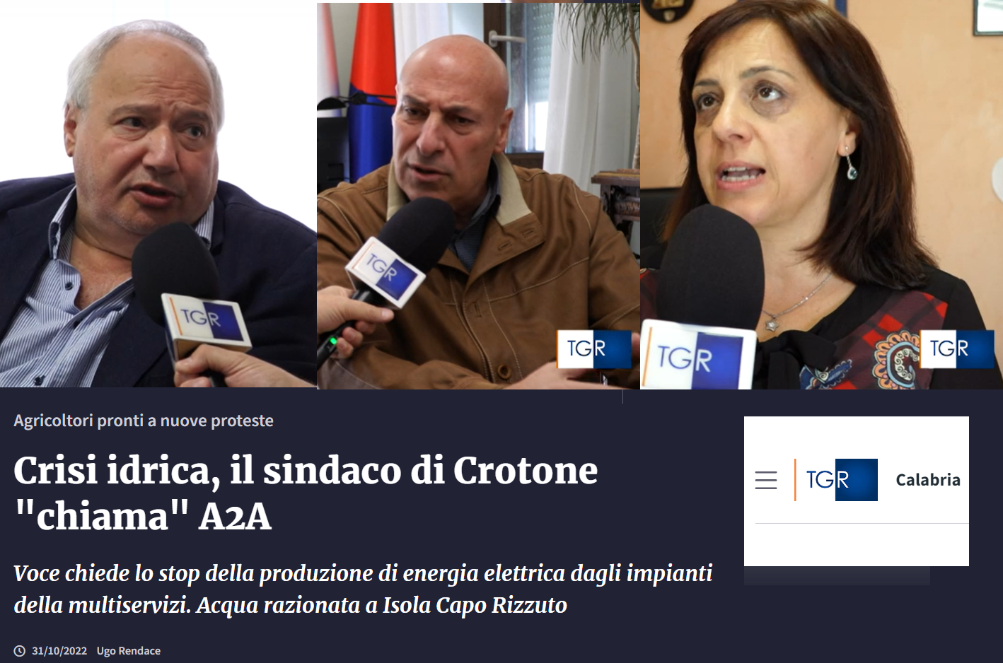 Ancora più sconcertante - continua Torchia -è che la Regione ha appreso, solo in tale occasione, la gravosa situazione, nonostante che, una settimana fa, il 17 ottobre, vi sia stata a Catanzaro una convention di A2A, niente di meno alla presenza del Presidente della multi utility Marco Patuano, alla quale la Regione Calabria ha partecipato in grande stile anche con la presenza dell’Assessore Gallo che, proprio in quella occasione, ha parlato di “rapporti positivi con A2A, improntati al reciproco rispetto», aggiungendo che «la Regione vuole investire sulle rinnovabili in sintonia con una grande società italiana, con la quale vogliamo ragionare di prospettive di sviluppo per la Calabria, utilizzando così al meglio le nostre risorse». Un elogio che è stato smentito dai fatti! E’ da un mese - espone Torchia - che sono in corso continue trattative con A2A per l’addendum alla convenzione del 1968. Sembrerebbe che un accordo, senza il coinvolgimento del territorio che ha dimostrato comunque negli anni di avere idee e progettualità chiare, anche se non sottoscritto, sia stato raggiunto. E’ incredibile che nonostante questi incontri, non sia stata mai affrontata la situazione attuale; che in pratica si raggiungesse un accordo su un qualcosa che almeno questo anno non c’era più. Ho già detto più volte, sempre inascoltato, - commenta amaramente Torchia - che la problematica dell’acqua nel nostro territorio provinciale debba essere affrontata e rivendicata come sistema territoriale nel suo complesso. E non può che essere assunta dalla classe dirigente del nostro territorio. Abbiamo più volte, segnalato a chi di dovere per iscritto, la necessità che la Regione in un certo qual modo obbligasse A2A a conservare l’acqua nei due laghi che, ricordiamolo, nascono come serbatoi artificiali di accumulo. Dei 130 milioni possibili di invasamento oggi ne registriamo, per ammissione di A2A, 4 milioni e settecentomila. Siamo davvero all’assurdo e alla vergogna! La Regione continua a non valorizzare uno dei principali asset di cui dispone, ed è costretta adesso a mettere le toppe che sono peggiori e più pericolose del buco! Che almeno questo serva una volta per tutte ad evitare che nel futuro si verifichi la stessa situazione. Roberto TorchiaPresidente Consorzio Bonifica e Irrigazione Ionio Crotonese